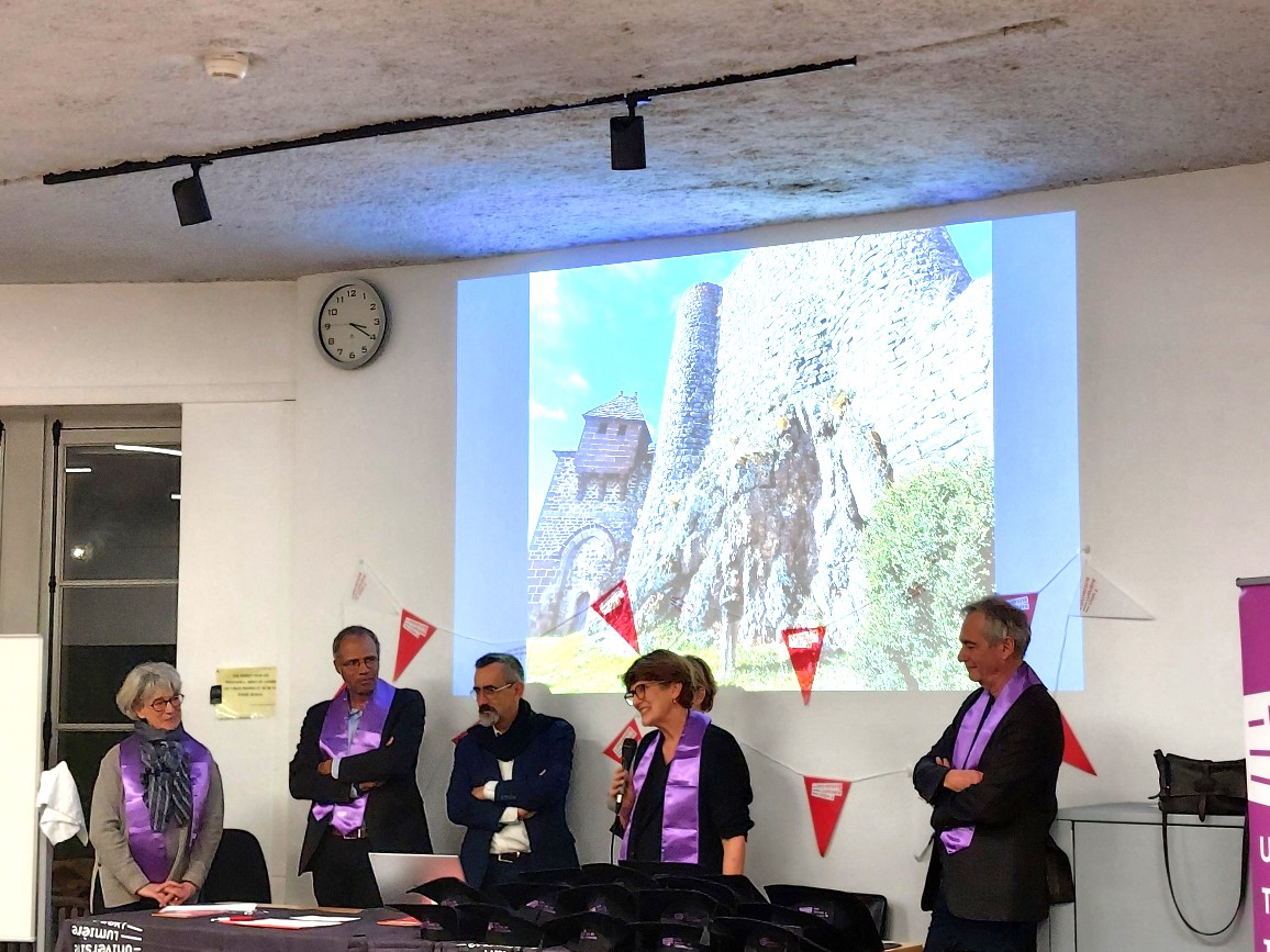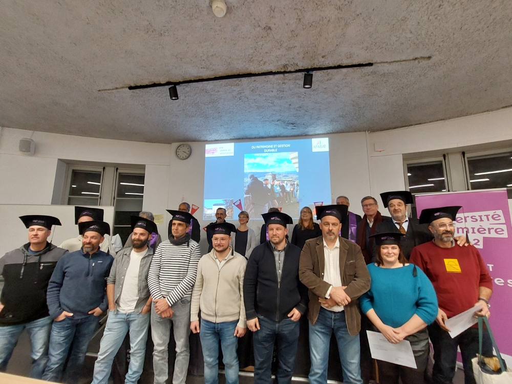 La cérémonie de remise des diplômes du DU Patrimoine et gestion durable s‘est tenue vendredi 28 novembre dans l’amphi Fugier en présence de Yannis Gourdon, Doyen de l'UFR Temps et Territoires, Nathalie Mathian maîtresse de conférences en histoire de l’art moderne et responsable du diplôme, Anne Baud, Professeure des Universités en Histoire de l'art et archéologie, Laurent Baridon, professeur des université en Histoire de l’art contemporaine, Gilbert Richaud, architecte et responsable des archives de la Société Académique d’Architecture de Lyon et Romain Damien, gestionnaire de scolarité du département Histoire de l'Art et Archéologie,